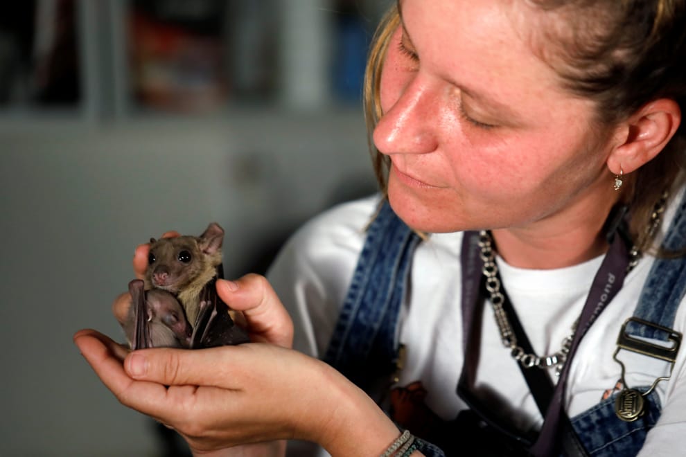 一名工作人員手上擺著一隻蝙蝠。