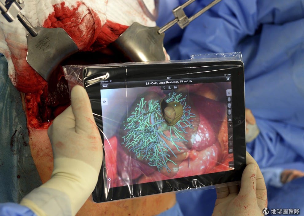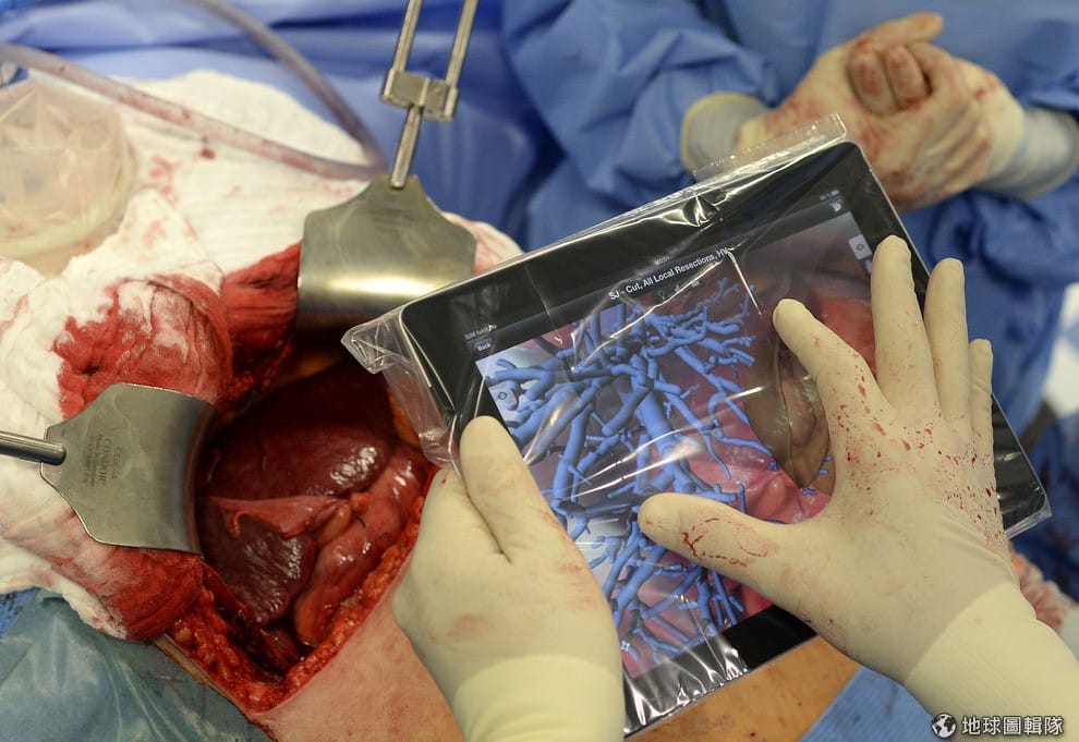 繼續閱讀醫生舉好平板對準切開的腹腔,可以從照片中看到,平板螢幕上的虛擬肝臟與真實的患部重疊一起,醫生可以在畫面的輔助下找到腫瘤位置。