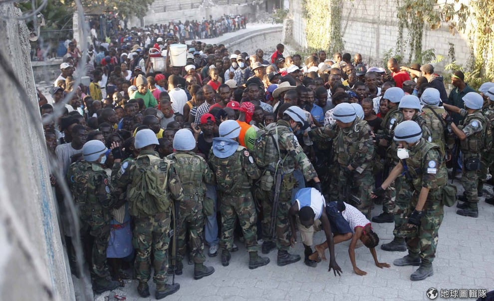 照片中是駐紮海地的聯合國維和部隊,海地民眾正在等待聯合國物資救援,部隊們正在維持秩序。