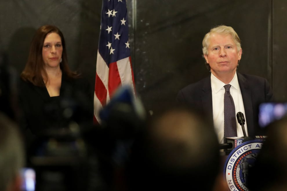 24號這天,曼哈頓區檢察官小萬斯(Cyrus Vance Jr.,右)和首席檢察官伊盧琪(Joan Illuzzi)出面接受媒體訪問。