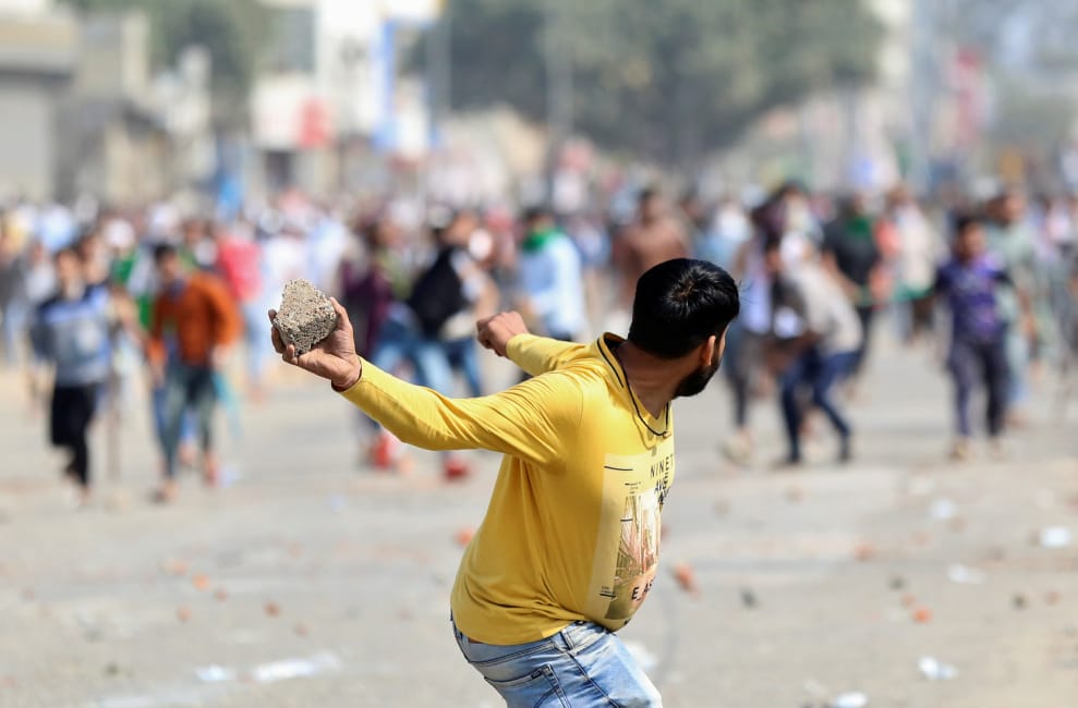 圖為德里一名支持《公民身份修正法案》者,預備朝反對者方向投擲石塊。