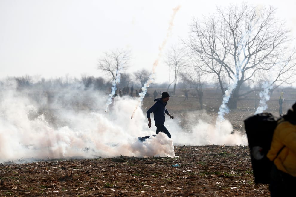 難民們在長途跋涉抵達希臘邊境後,等待他們的是全副武裝的邊境守衛和催淚瓦斯。守衛們朝難民群眾發射催淚瓦斯,希望能驅散他們。