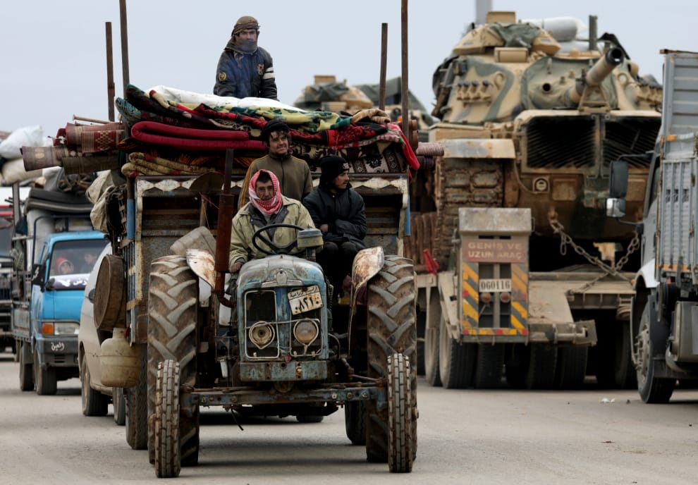 流離失所的難民開著曳引機離開危險的戰區,一旁則是準備進入戰區的土耳其戰車。