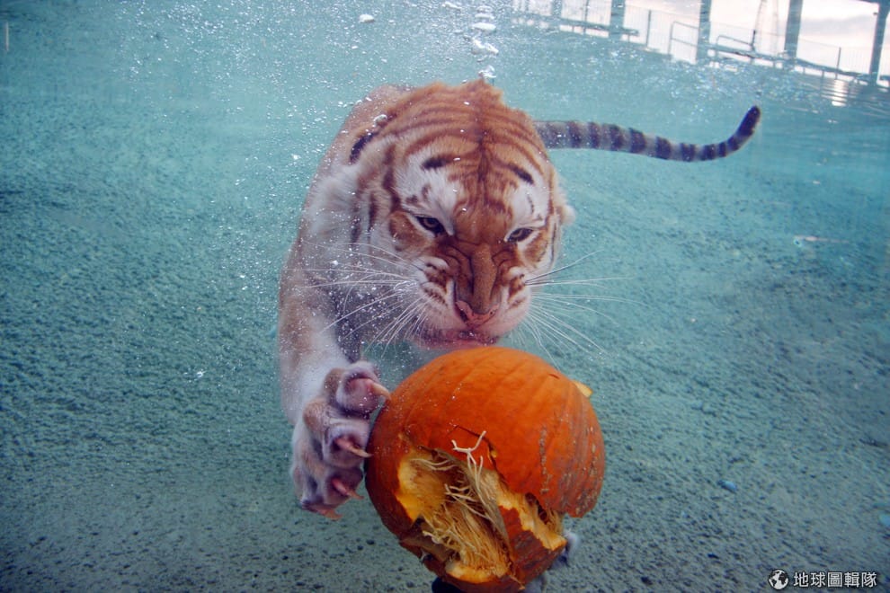 六旗遊樂園中的孟加拉虎Kingda Ka正在水裡面玩著工作人員丟給牠的南瓜。