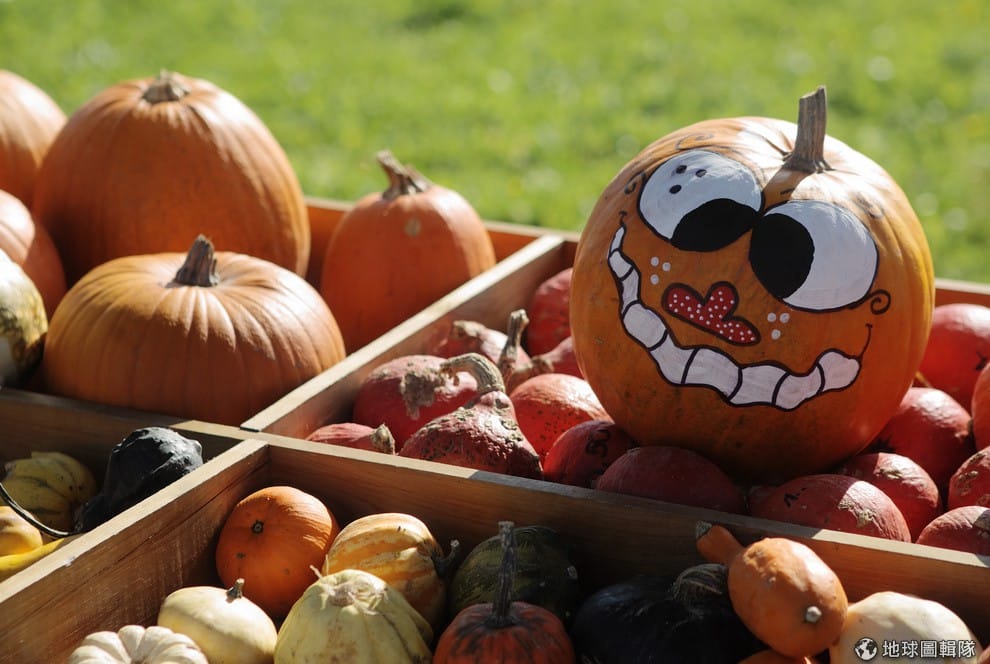 奧地利維也納的南瓜攤上擺著一顆滑稽笑臉的大南瓜。