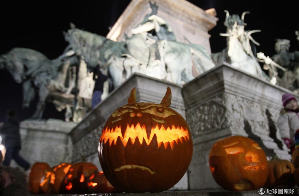 匈牙利布達佩斯市區內辦起南瓜燈節,各種精雕的南瓜放在地上綻放光芒,讓轉冷的天氣多了一絲暖意。