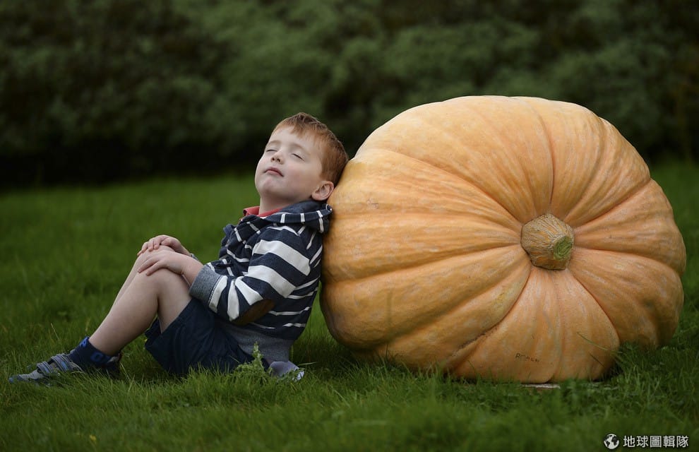 知名的哈羅蓋特園藝展上,處處都是超大型的蔬菜,小男生靠在大南瓜旁對攝影師擺出怪表情。