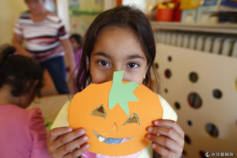 來自敘利亞的小女生暫時安置在德國護士學校,她開心地拿著南瓜剪紙對攝影師靦腆微笑。