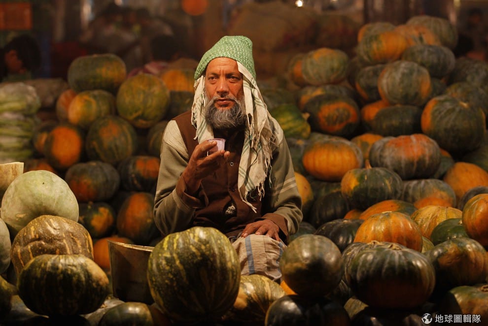印度新德里的南瓜攤上,小販背後是層層疊疊的南瓜山。