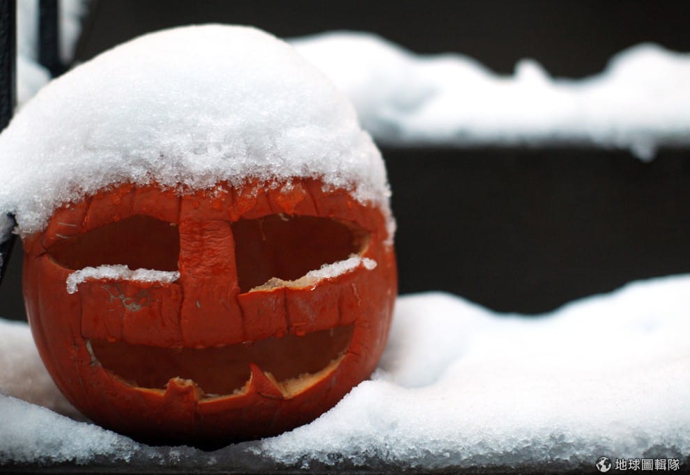 紐約布魯克林區的住宅前,一顆雕刻好的南瓜擺在石階上,覆蓋上方的皚皚白雪就像是南瓜的白髮一樣。