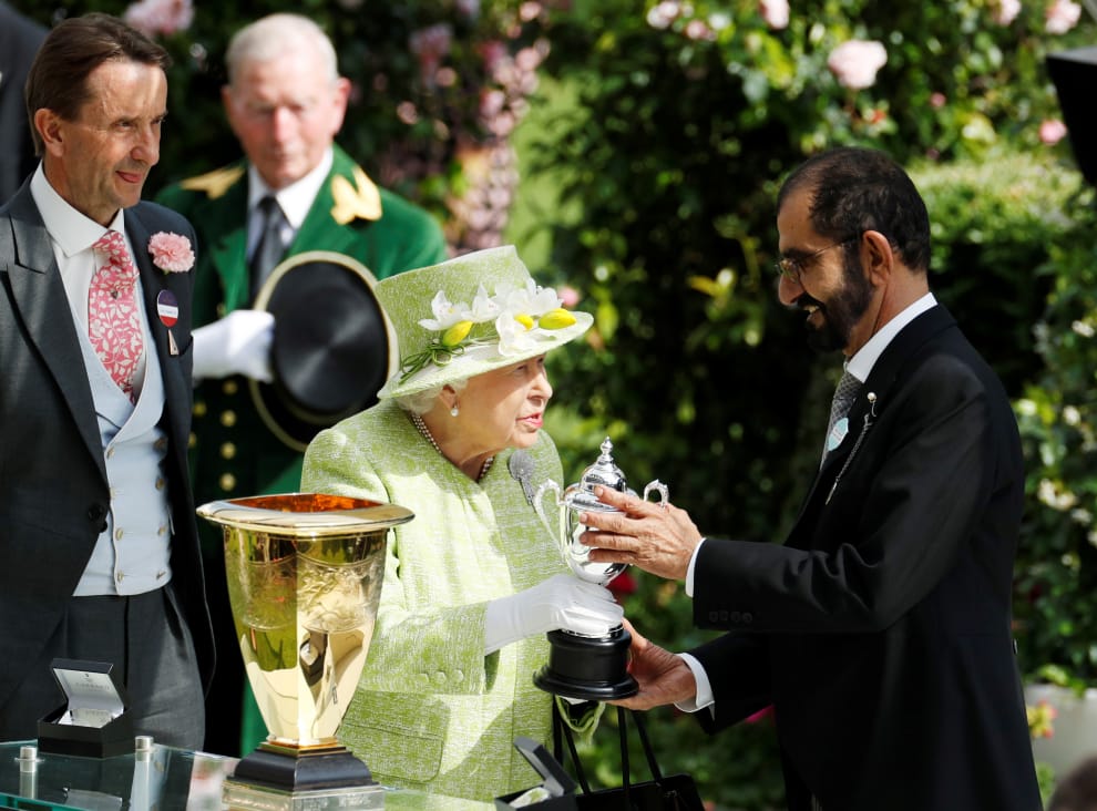 無論是杜拜酋長還是哈雅王妃,他們都和英國王室十分親近。杜拜酋長更是高多芬(Godolphin)賽馬機構的創辦人,圖為他(右)在 2019年英國皇家艾斯卡賽馬會(Royal Ascot)和女王伊莉莎白(Queen Elizabeth)的合影。