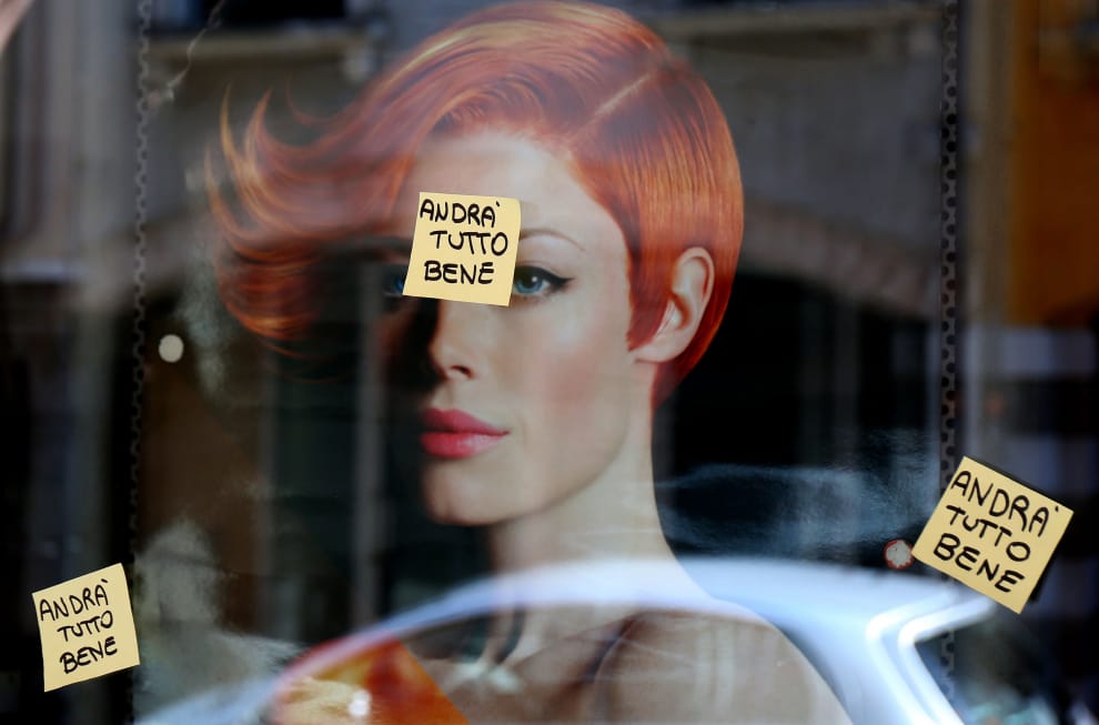 在遭到封城的北義帕多瓦省,櫥窗被貼上了寫有「一切都會好起來」字樣的便利貼。