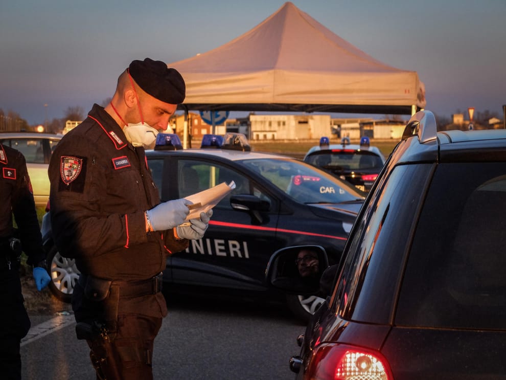 在遭到封城的倫巴底大區的卡薩爾普斯泰爾倫戈市(Casalpusterlengo),義大利憲兵將通往外頭的路給擋了起來。