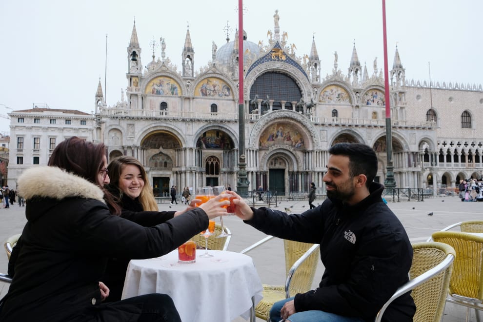 在少了大量觀光客的威尼斯聖馬可廣場,威尼斯人自己喝起了國民雞尾酒Aperol Spritz。