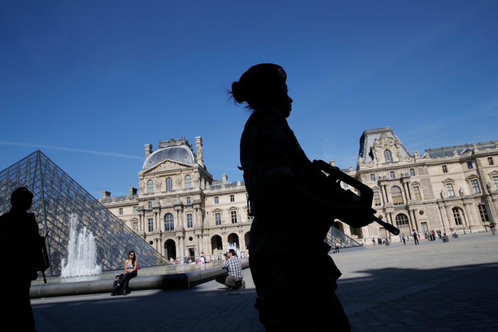 嫌犯犯案的時間點正好是法國深受恐怖主義攻擊所苦的時候,他們利用受害者的愛國心得逞。圖為在巴黎羅浮宮附近巡邏的軍人。