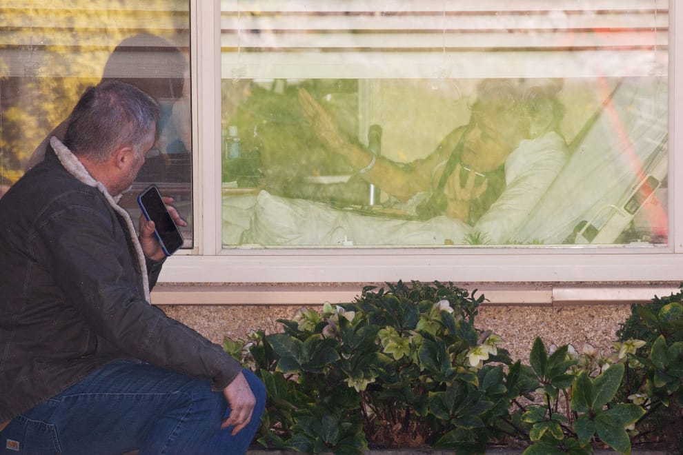 在美國華盛頓州,夏普(Marty Shape,左)到安養中心用手機與母親隔窗聊天,他的母親因確診COVID-19(武漢肺炎)必須被隔離。當人們碰面的機會變少,人與人之間連結的機會也隨之減少。