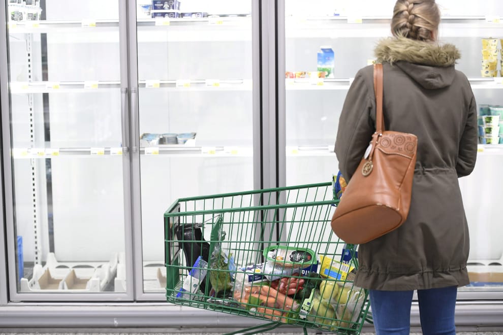 路透社 / 達志影像來到芬蘭首都赫爾辛基(Helsinki)的超市,一樣也能看到消費者在幾近全空的貨架挑選商品的畫面。