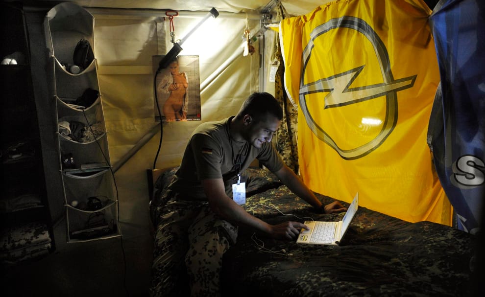 2009年,一名德國聯邦國防軍在他的野地營帳中使用筆電。