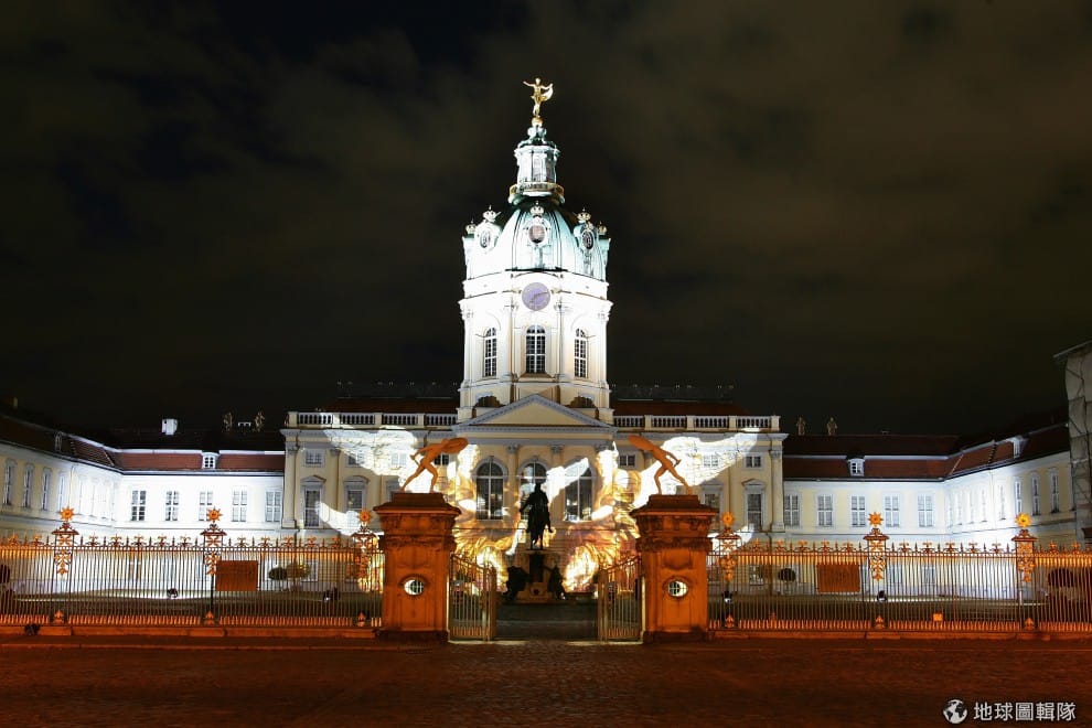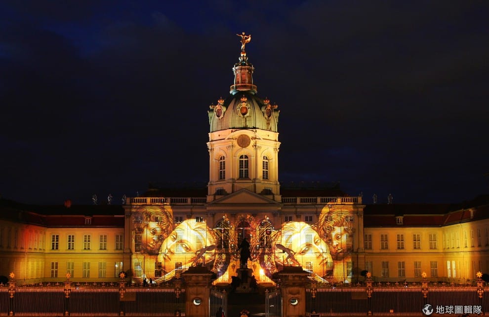 「夏洛特堡宮」是德國相當著名的觀光景點,活動期間被染上了人物表情的燈光,非常特別的景象。夏洛特堡宮(The Charlottenburg Palace)是德國柏林現存最大的宮殿;建於十七世紀末,當初國王腓特烈三世為了妻子而興建的夏宮,並用皇后的名字命名(Sophie Charlotte)。圖片來源:Andreas Rentz/Getty Images