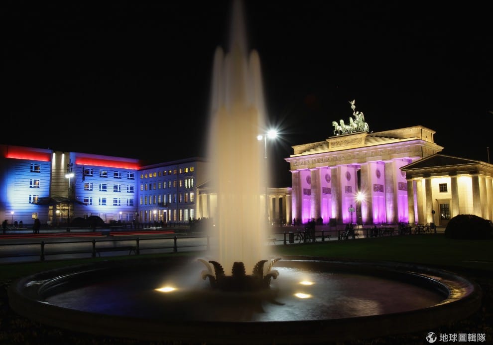 左邊是美國駐德國大使館、以及右邊的「布蘭登堡門」都成為燈光藝術家的最佳畫布。圖片來源:Andreas Rentz/Getty Images