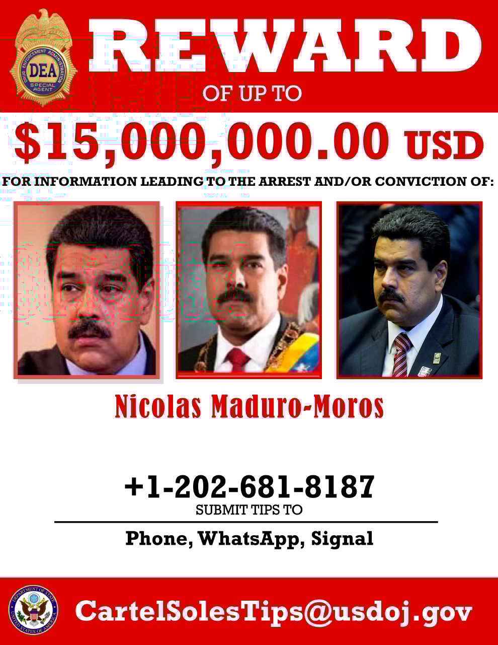 有鑑於馬杜洛的罪行重大,美國國務院也在同一天宣布懸賞 1,500萬美元(折台幣約 4億5,675萬元),請民眾提供可以逮捕馬杜洛的資訊。美國國務院表示:「委內瑞拉人民值得一個透明、負責任和具代表性的政府,一個能夠服務人民的需求,並且沒有參與不法運毒情事的政府。」