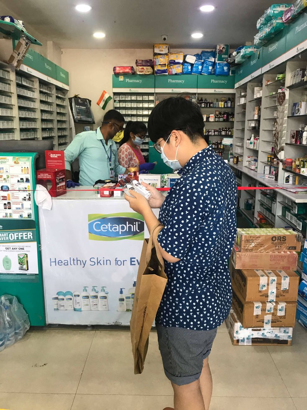 圖為本文作者,正在藥局裡準備購買防疫物資。