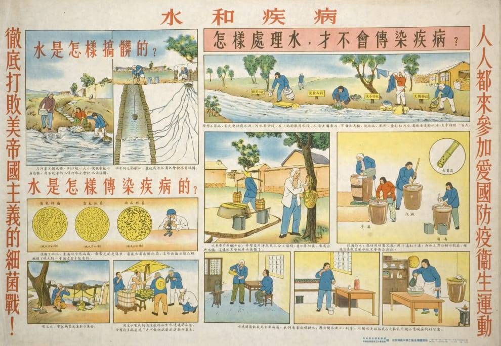 1952 年中國的衛教海報,公共衛生與愛國、反帝運動相互結合,創造出一套民族主義的防疫論述。疫病防治,即是對抗西方帝國的救國之戰。