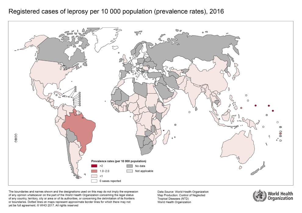 2016 年世界衛生組織公布的全球麻風地圖,僅剩巴西一帶盛行率超過萬分之一。