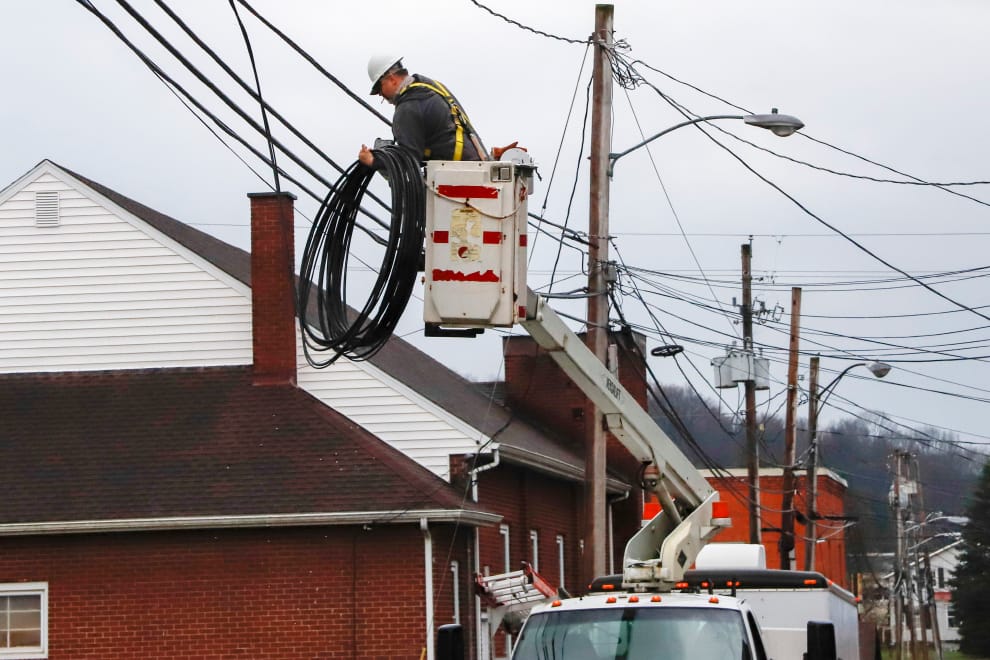 圖為俄亥俄州(Ohio)一名正在維修電線的工人。自從美國各州陸續宣布居家隔離命令後,許多人不能外出工作,經濟也因此陷入困境。