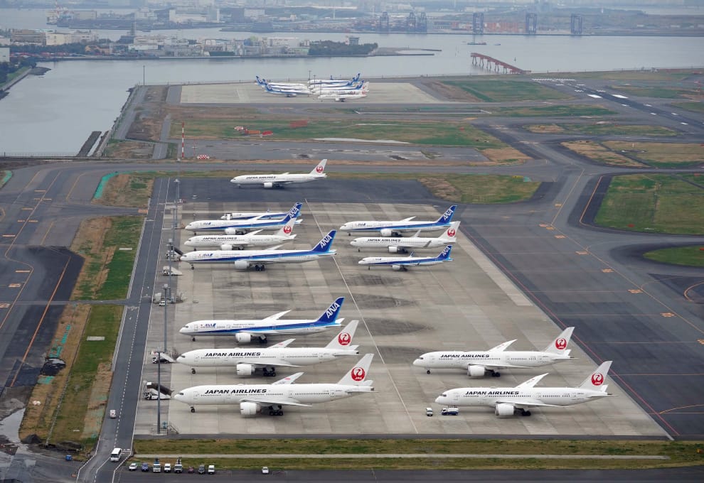 圖為停在日本羽田國際機場的飛機。在COVID-19(武漢肺炎)爆發後,包括美國在內的多個國家都祭出旅遊限制令,各大航空公司更是因此取消多個航班,損失嚴重。
