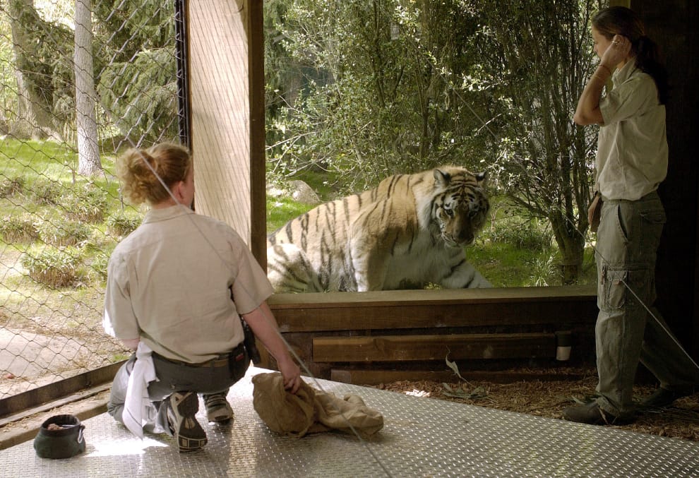 在COVID-19(武漢肺炎)疫情蔓延的現在,動物園工作人員在照護動物上也要格外注意。圖為在疫情尚未延燒之時,布朗克斯動物園工作人員照顧老虎的畫面。