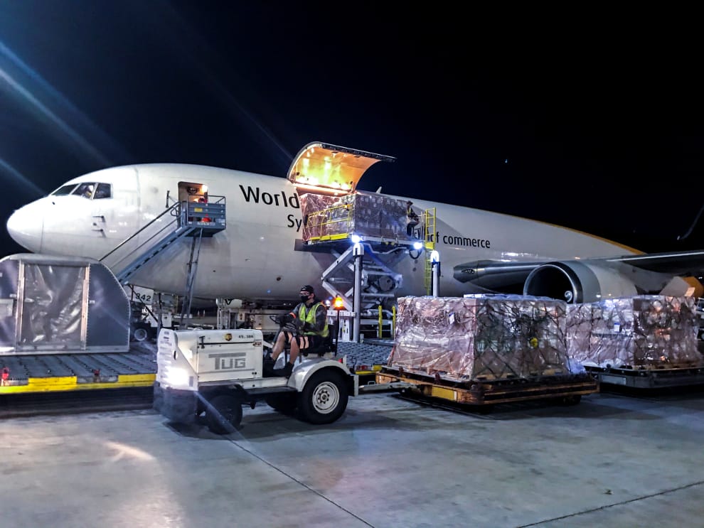 圖為美國邁阿密(Miami)一架正在卸貨的貨機。除了德、法兩國,巴西也遇到類似情形,美國的貨機當場把原本預定送抵巴西的物資載走。