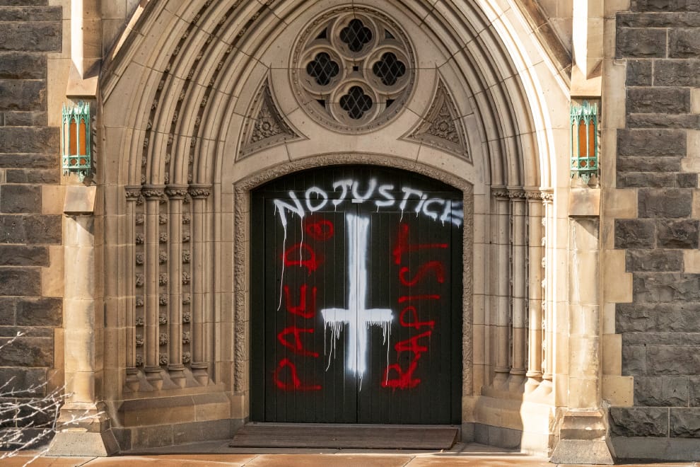 在澳洲最高法院的無罪判決出爐後,位於墨爾本的聖派翠克大教堂遭人塗鴉,上頭寫道「沒有正義」。