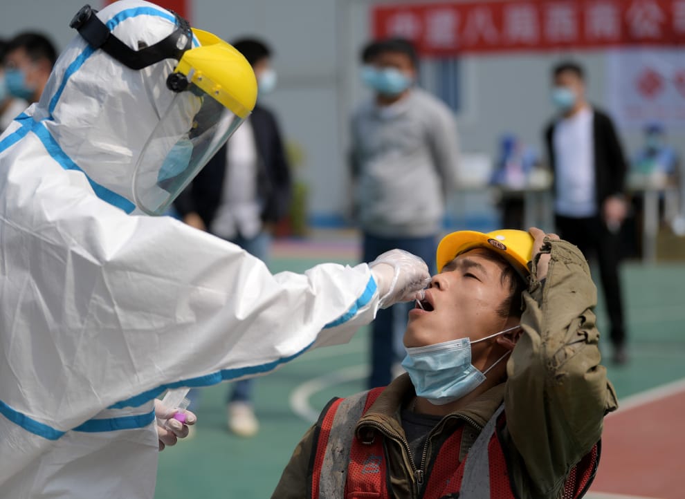 一名醫護人員身著全套的防護服,替一名建築工人做篩檢。