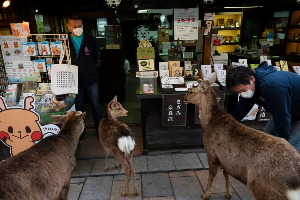 通常,大部分的奈良小鹿都會待在寺廟附近的公園內,等著觀光客們買鹿仙貝來「孝敬」牠們,但現在牠們卻遲遲等不到鹿仙貝。