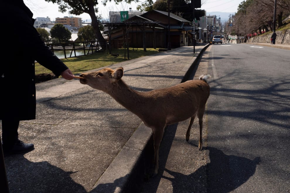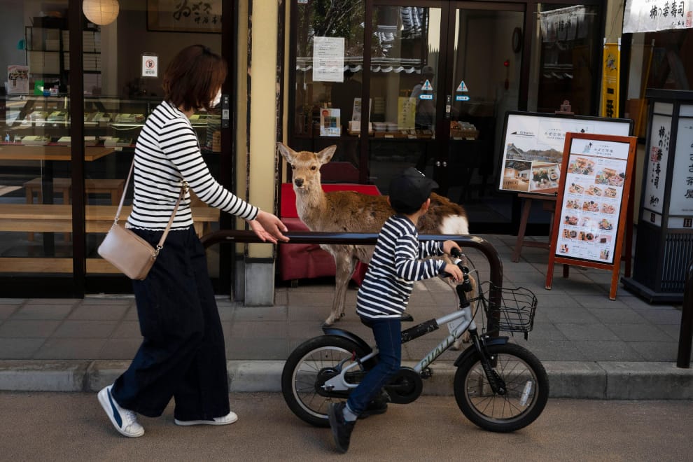 在日本當局呼籲民眾盡量不要去人群密集處之後,街頭少了人潮,讓奈良的代表性動物──鹿更加顯眼。