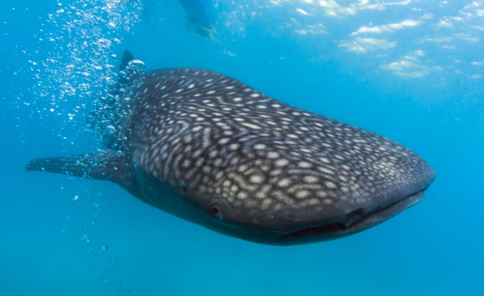 攝影師在加拉巴哥群島(Galapagos Islands)附近,拍下這張鯨鯊與人類共游的照片。保育鯨鯊不只有保護海洋生態上的考量,也有發展生態觀光產業的機會。