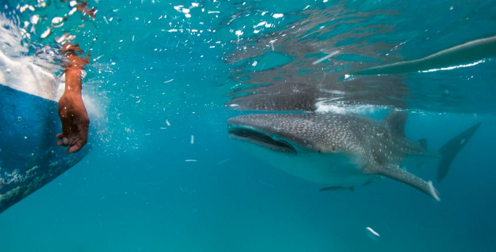 在菲律賓的歐梭羅,一隻鯨鯊靠近一名船上觀光客的手。這次,科學家透過放射性碳年代測定法,終於算出鯨鯊的年紀。