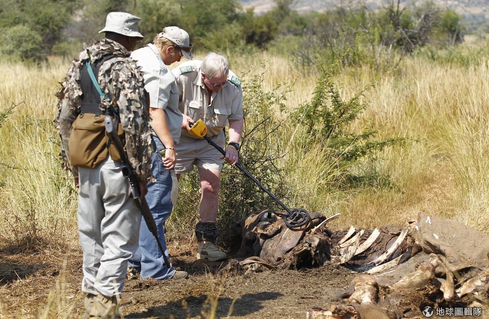 上圖為動物保育學者在調查犀牛盜獵現場。