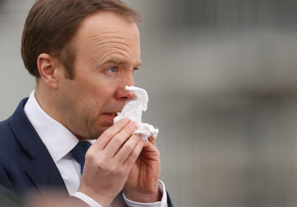 圖為英國衛生大臣韓考克在 4月3日於NHS醫院擤鼻涕的照片。他在 3月27日宣布確診罹患COVID-19(武漢肺炎),不過症狀輕微,所以他在家隔離 6天康復後又重返防疫第一線。