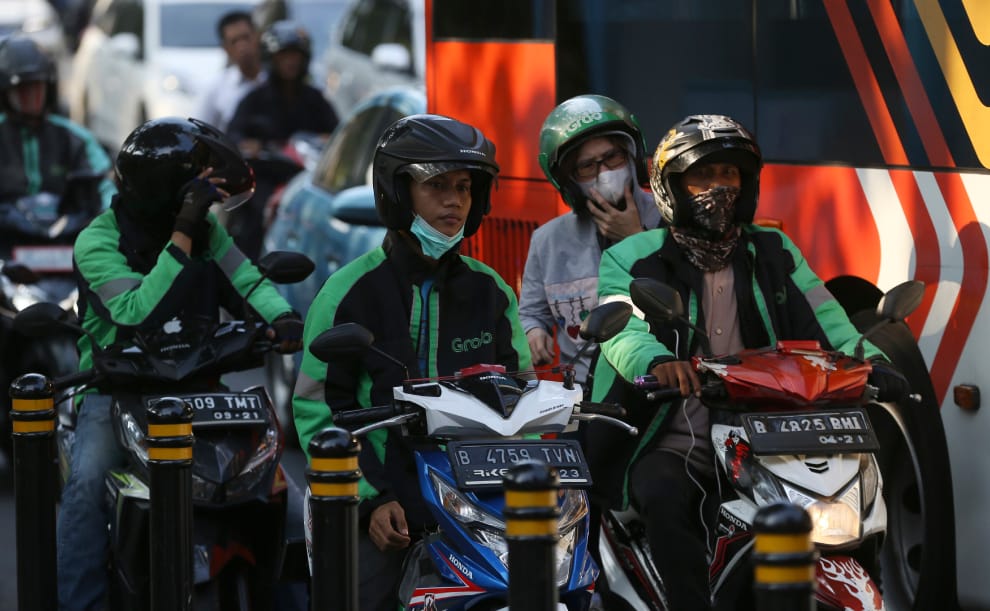 圖為印尼另一個重要的摩托計程車公司Grab。印尼衛生部長及交通部長互相牴觸的命令,引發大量政治人物及公民團體的反對,認為同時執行會造成執法困難。