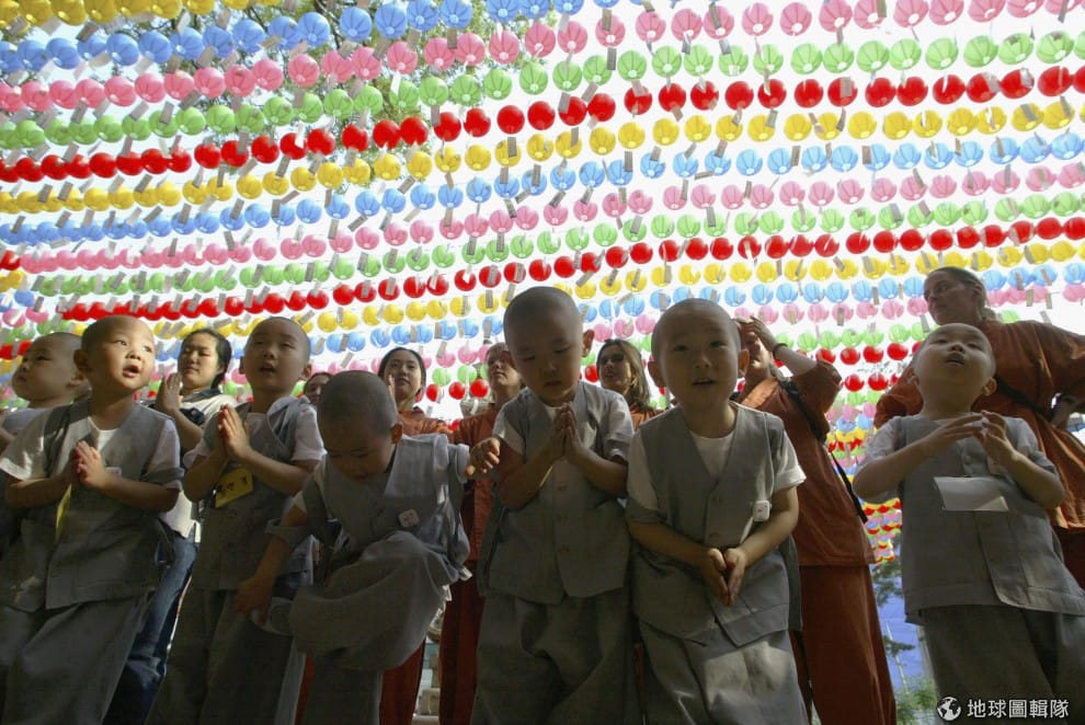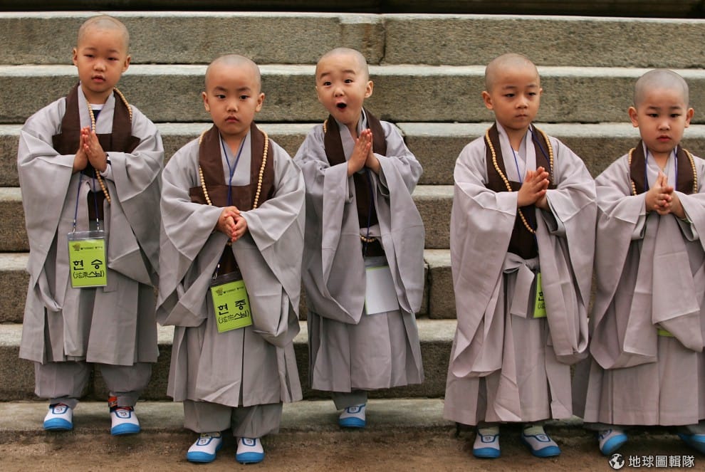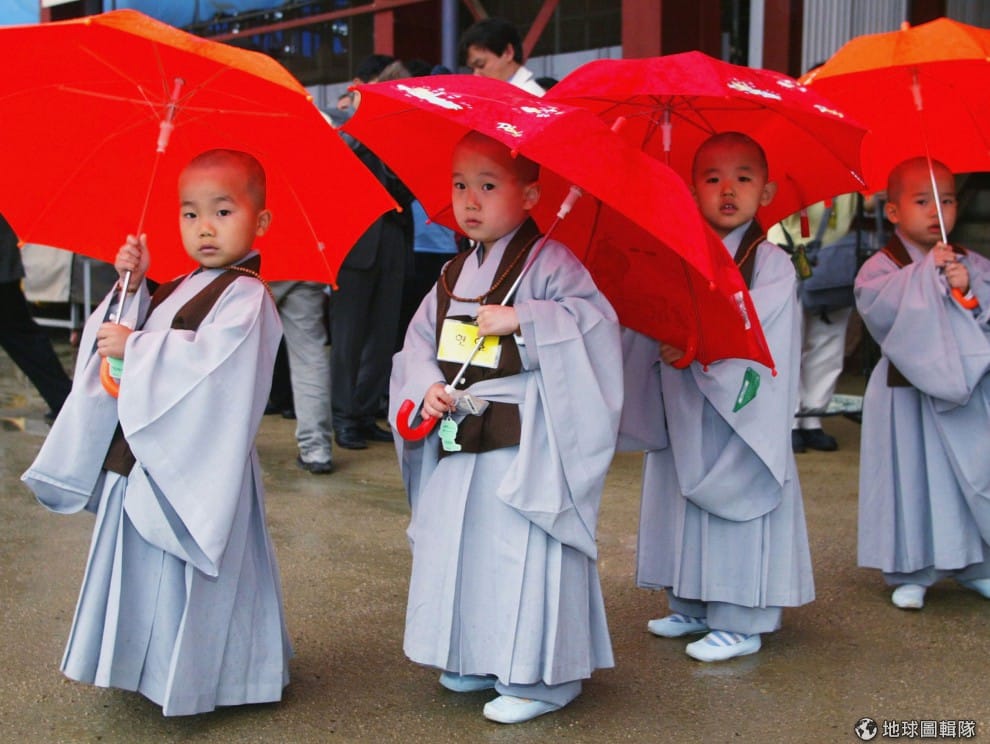 完成出家的過程後,小和尚們排排站。圖片來源:Chung Sung-Jun/Getty Images