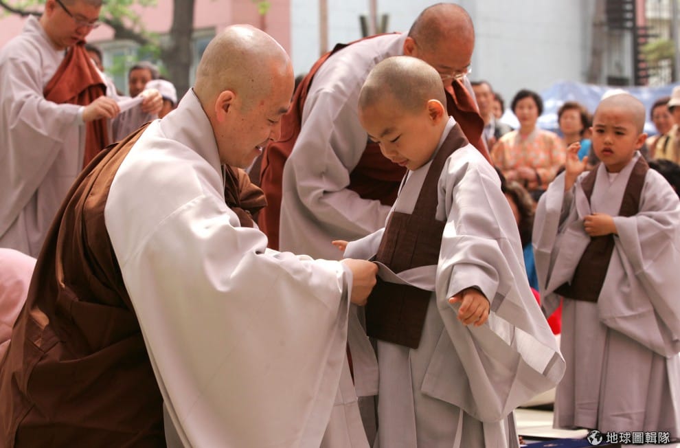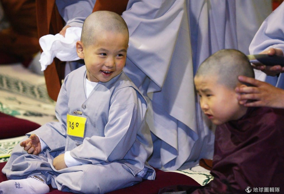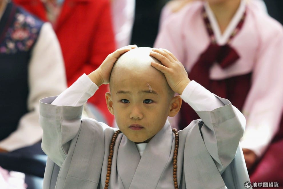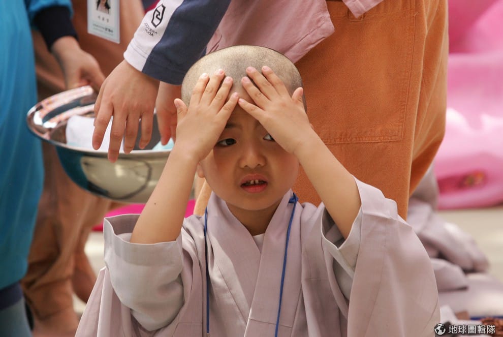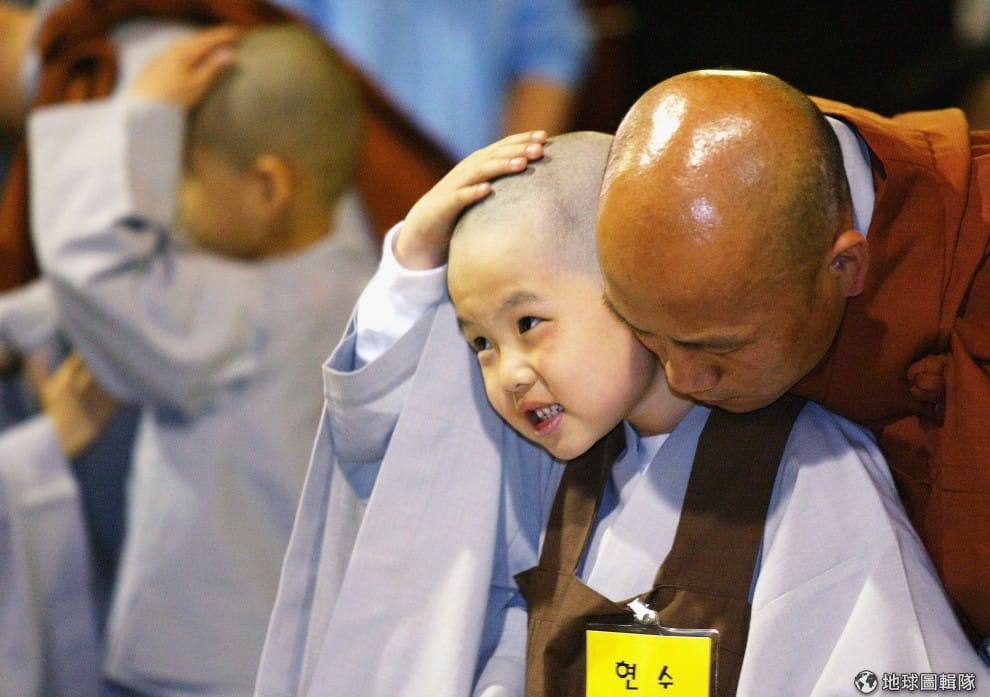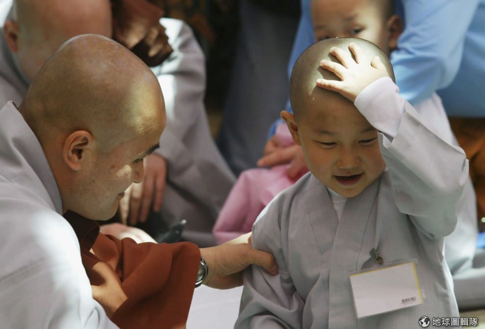 師傅要幫小朋友穿好袈裟,小和尚摸著自己的小光頭不過癮,還摸起師父的頭來!圖片來源:Chung Sung-Jun/Getty Images