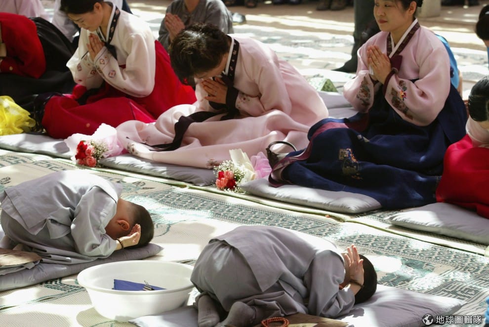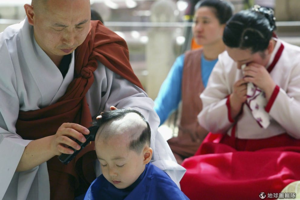 全部的小朋友都剃完頭髮後,開始行禮進行接下來的入寺過程。圖片來源:Chung Sung-Jun/Getty Images