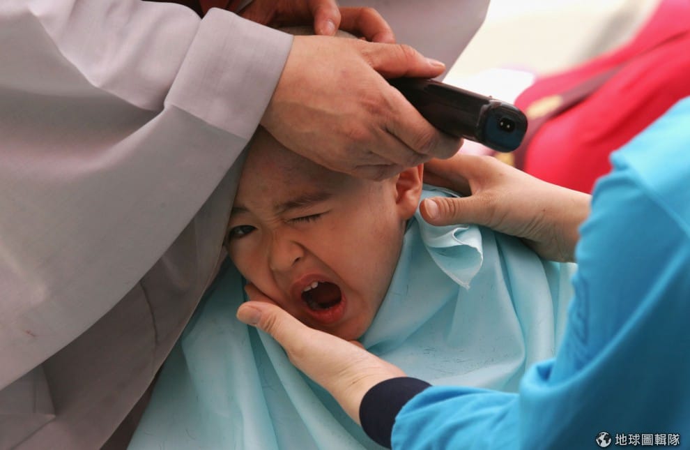 剃頭髮的時候,有的小朋友忍不住掙扎。圖片來源:Chung Sung-Jun/Getty Images