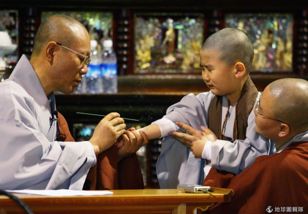 剃髮完成後,進行「點香疤」的過程,燃燒的香頭點在手臂上,小和尚都嚇哭了。圖片來源:Chung Sung-Jun/Getty Images