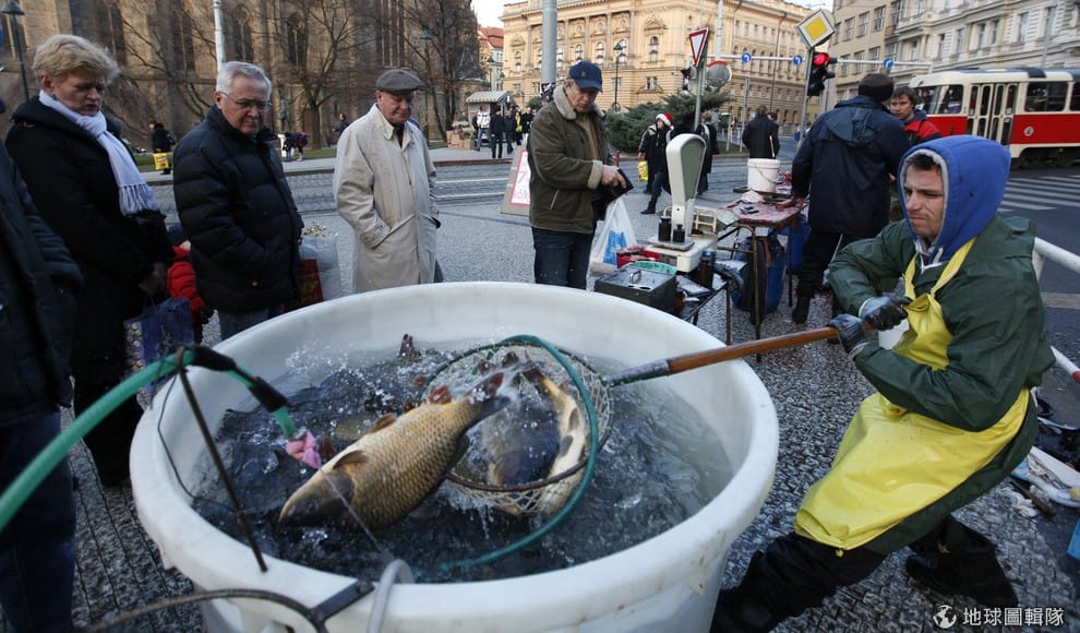捷克有9成的鯉魚都是採用活魚販賣的方式,魚販們會在街道兩旁架起攤位,擺上大大的魚缸,讓顧客直接看著還活跳跳的鯉魚挑選。所以大街上滿是魚缸的景象,也成了捷克在聖誕節來臨前的特殊景象之一。