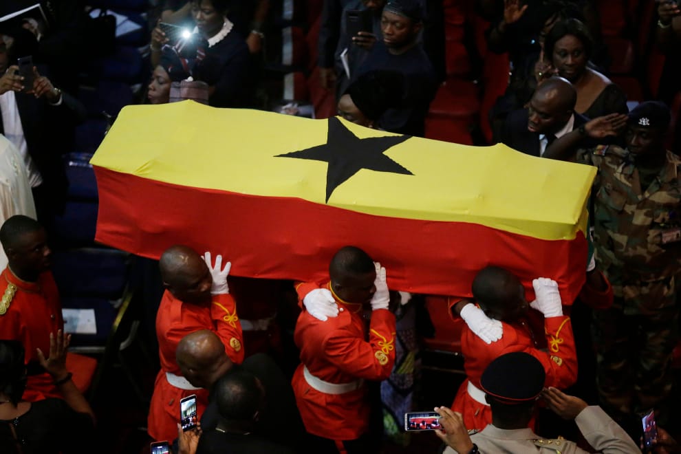 2018年9月13日,迦納軍人們擔任抬棺手,抬著聯合國第七任秘書長安南(Kofi Annan)的棺木進行喪禮儀式。