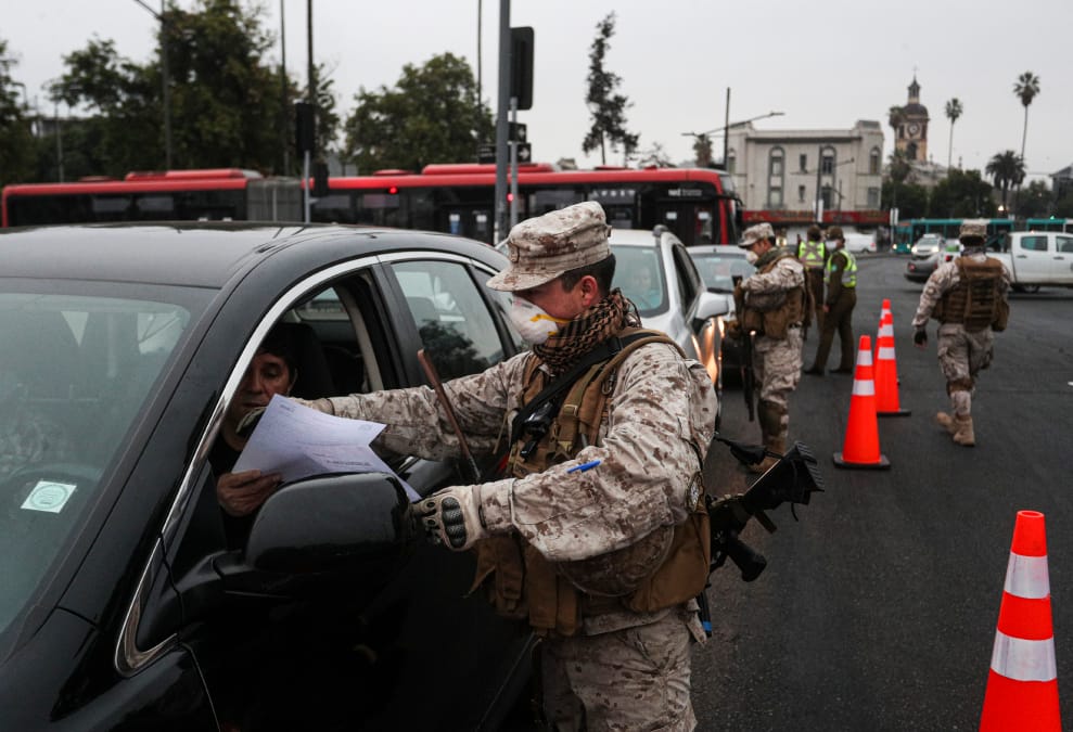 除了智利,德國、義大利、英國等政府也都在考慮發行「免疫護照」,希望盡快解除封鎖令,讓民眾回歸日常生活。圖為正在檢查民眾出入證明的智利軍人。