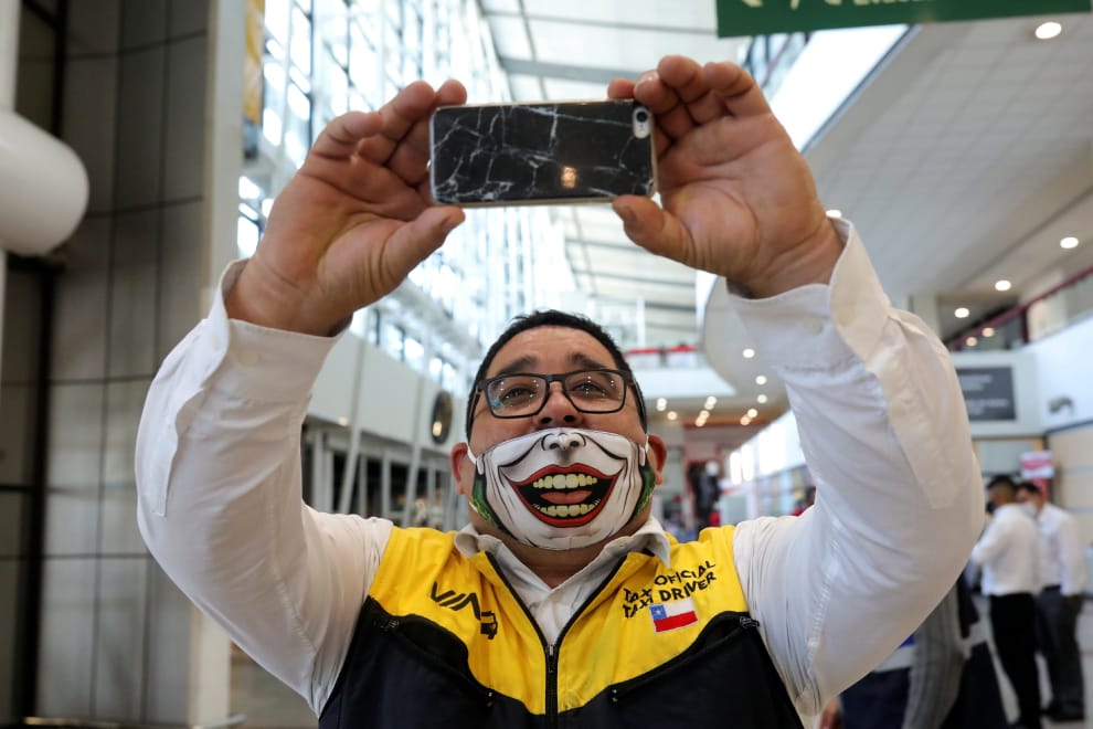 20號這天,一名計程車司機在智利首都聖地牙哥機場戴著口罩拍照。